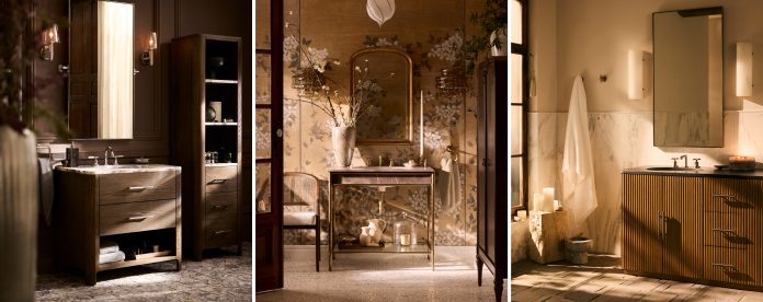 Vanities are available in powder, single, single wide and double configurations, with matching etageres and customizable hardware finished in Antique Brass or Polished Nickel. Pieces with wood detail are crafted with marine-grade plywood and all pieces feature soft-close functionality, pre-drilled countertops and French cleat wall mounts for secure installation.