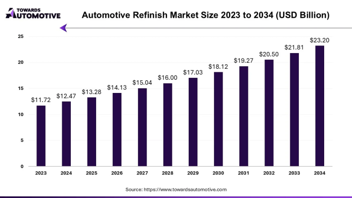 Ottawa, Aug. 25, 2025 (GLOBE NEWSWIRE) — The global automotive refinish market size stood at USD 13.28 billion in 2025 and is projected to reach USD 23.2 billion by 2034, according to a study published by Towards Automotive, a sister firm of Precedence Research.